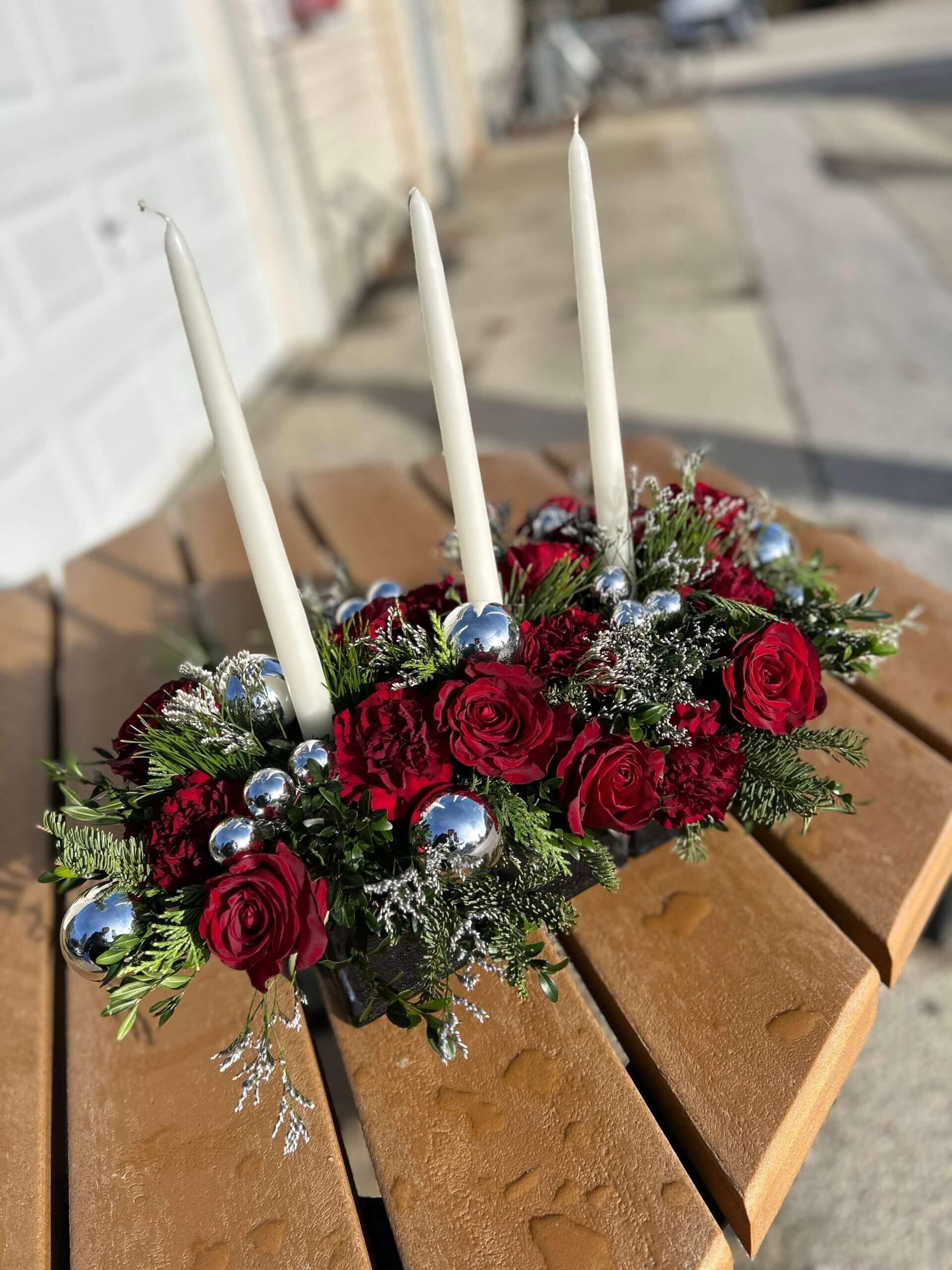 Marron Carnations, Dark Red Roses, Silver Balls, Sea Lavendar, and White Candles