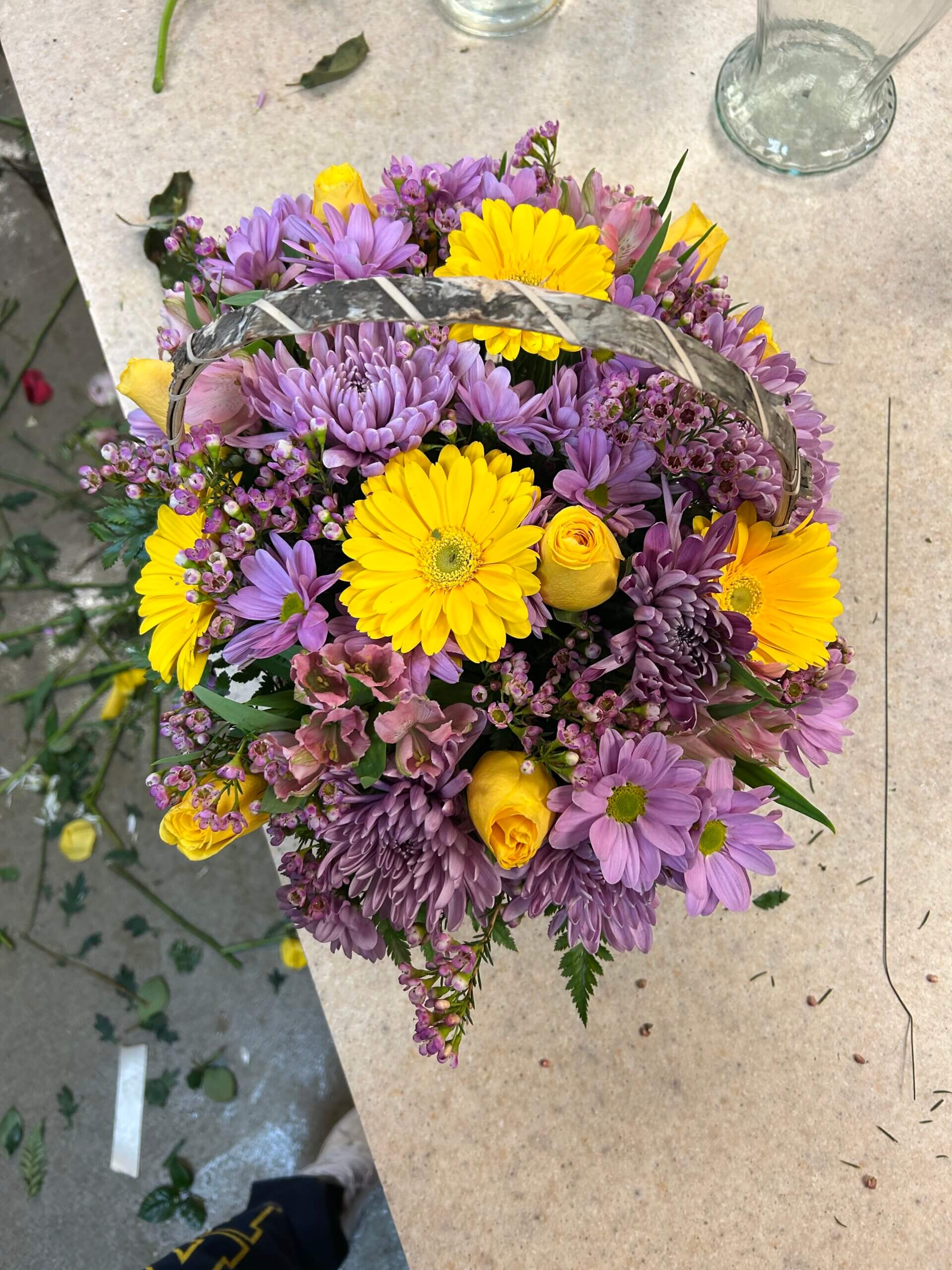 Purple Cushion Poms, Purple Daisy Poms, Yellow Roses, Yellow Gerbs, Pink Wax, Purple Mums, Pink Alstroemeria