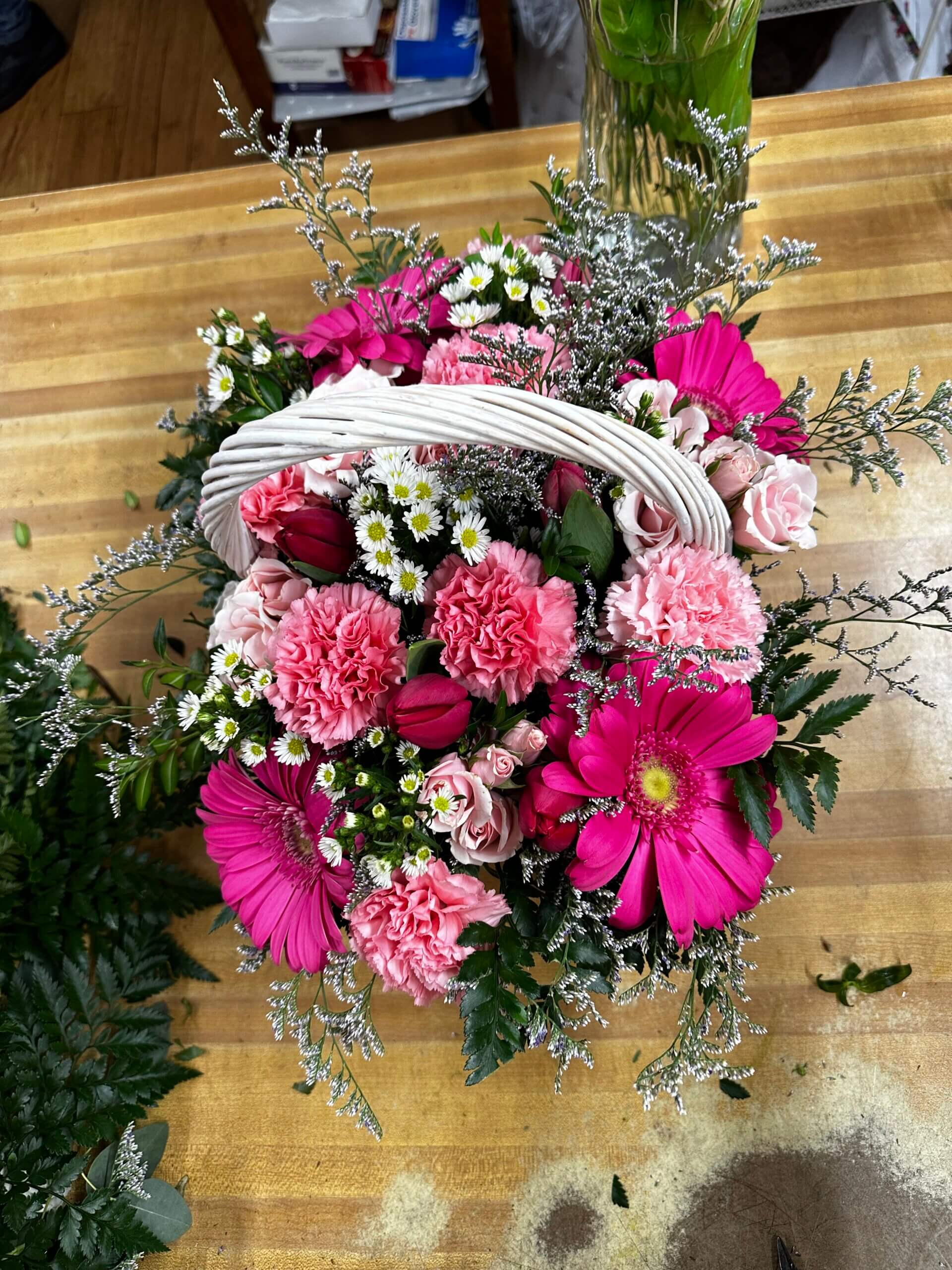 White Basket, Pink Carnation, Hot Pink Gerbs, Hot Pink Tulips, White Monte Cassino, Light Pink Spray Roses, and Limonium