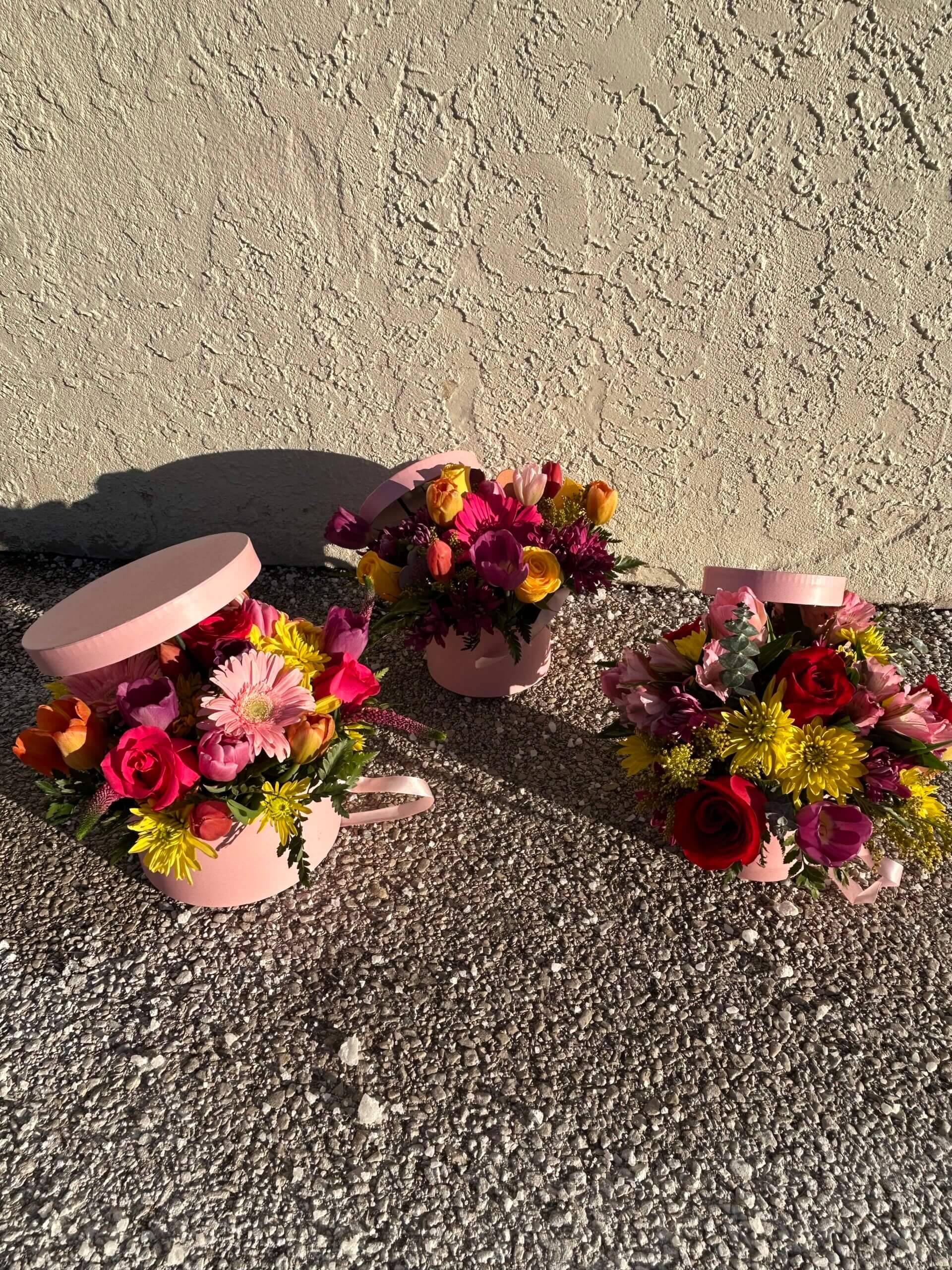 Pink Gift Box, Tulips, Yellow cushion poms, Lavendar Cushion poms, Solidago, Yellow Roses, Hot Pink Gerbera Daisy, Yellow Gerbera Daisy, Pink Alstroemeria, Hot Pink Roses, Red Roses, Hot Pink Veronica, and Candy Pops sticks