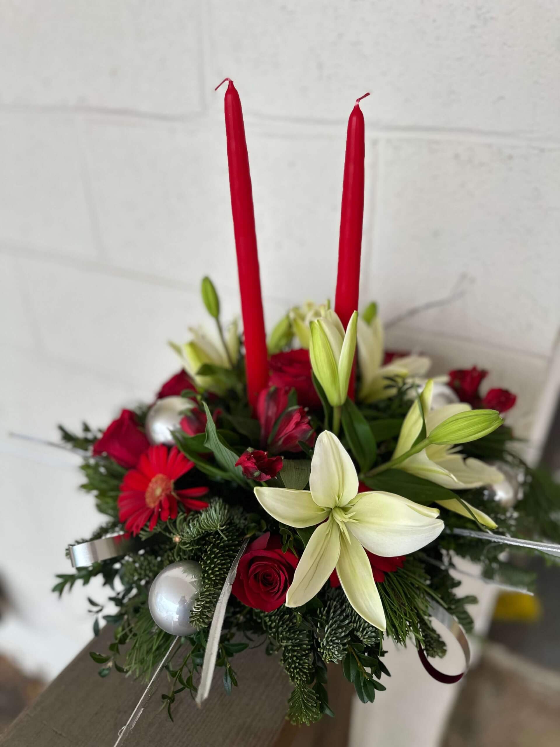 White Lilles, Red Roses, Red Astro Merriam, Red Gerbs,  Silver Balls, Silver Sticks, Silver Bows and Red Candles